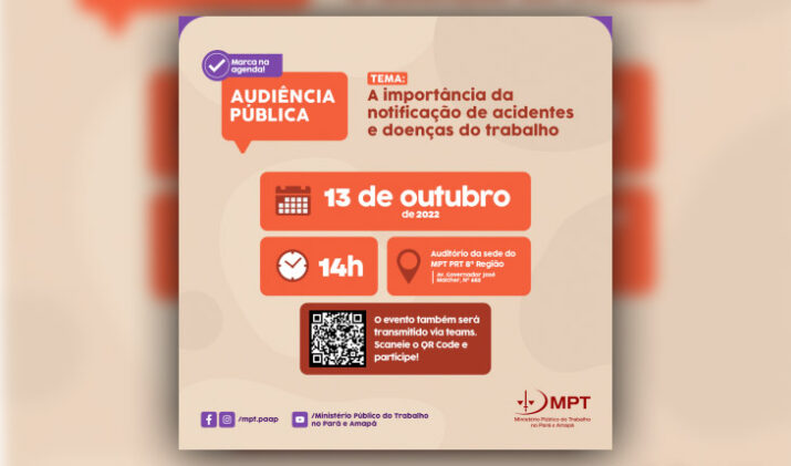 O Ministério Público do Trabalho no Pará e Amapá (MPT PA-AP) realiza, no próximo dia 13 de outubro de 2022, às 14 horas, uma audiência pública sobre a importância da notificação de acidentes e doenças do trabalho. Foram convidados representantes de entidades privadas, sindicatos, organizações governamentais e não governamental, além do público geral interessado. A…