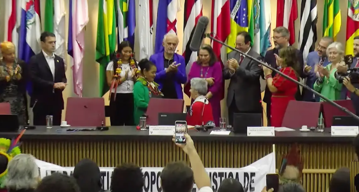 Presidenta da Comissão, Enéa de Stutz e Almeida, pede desculpas de joelhos às comunidades krenak e guarani-kaiowá.