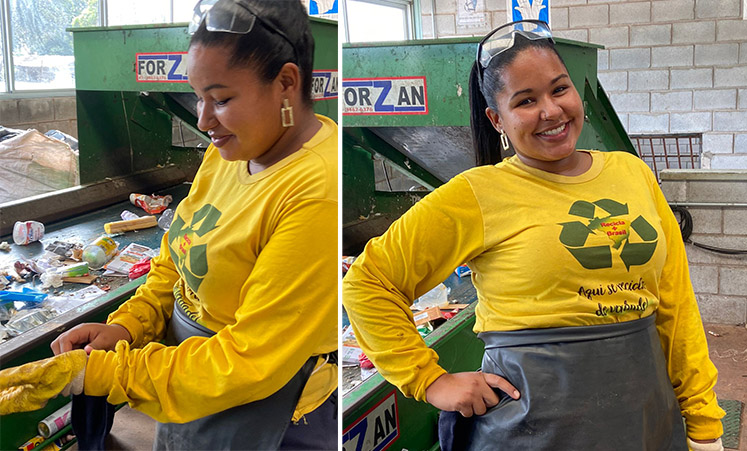 Ediely Carla é mãe solo, tem 22 anos, mora com a mãe e tem uma filha de 2 anos. Sem trabalho por conta da pandemia, Ediely encontrou na reciclagem uma solução para sua situação de vulnerabilidade. “Eu encontrei uma oportunidade aqui. Cheguei aqui através de um amigo, fui indicada, estava parada. Eu cheguei pra ajudar mesmo. Eu não conhecia o trabalha das catadoras, quando cheguei aqui me surpreendi. Tudo muito organizado. A gente achava que era uma coisa e na verdade era outra. Aqui eu me senti realizada.”