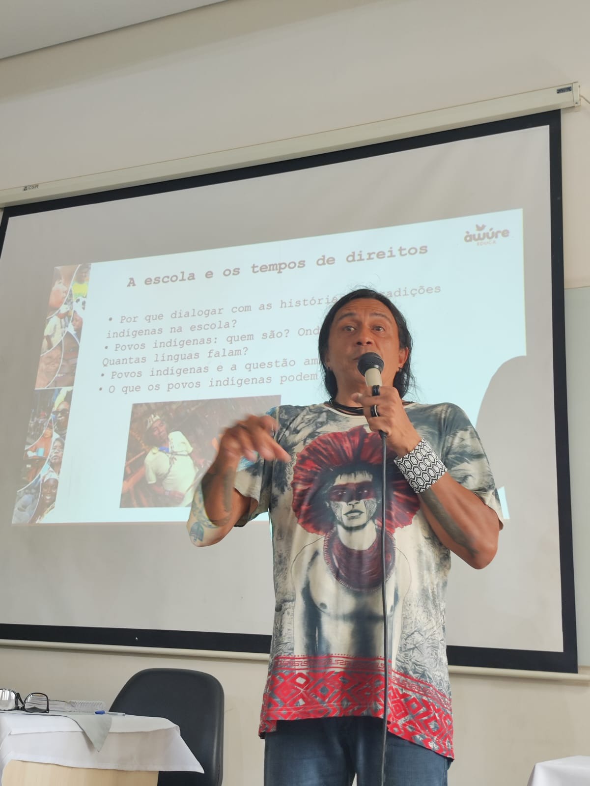 O evento acadêmico, que começou dia 25 e vai até dia 28 de setembro, acontece no campus de Goiânia do IFG e aborda o tema “NUNCA MAIS UM BRASIL SEM NÓS: Populações indígenas em diálogo com a escrita e o Ensino de História”. A conferência de abertura destacou a importância do ensino de história indígena na formação educacional, sob o tema “Povos Indígenas no Brasil: O que a escola tem a ver com isso?”, e ficou por conta do professor e Dr. Edson Kayapó, um dos colaboradores do projeto Àwúre e ativista do movimento indígena e ambientalista. Edson pertence ao povo Mebengokré, do estado do Amapá/AP, é graduado em História pela Universidade Federal de Minas Gerais, com pós-graduação lato sensu (especialização) em História e Historiografia da Amazônia, pela Universidade Federal do Amapá, é também Doutor pelo EHPS/PUC-SP e Mestre em História Social pela mesma instituição.