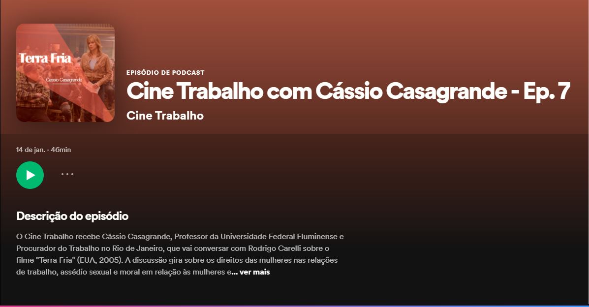 Ele conversa com Rodrigo Carelli sobre o filme “Terra Fria”, uma produção estadunidense de 2005. Eles vão discutir sobre a questão de gênero nos locais de trabalho, machismo, misoginia, assédio sexual, ações afirmativas e de quebra sobre as class actions, as ações judiciais coletivas norte-americanas.