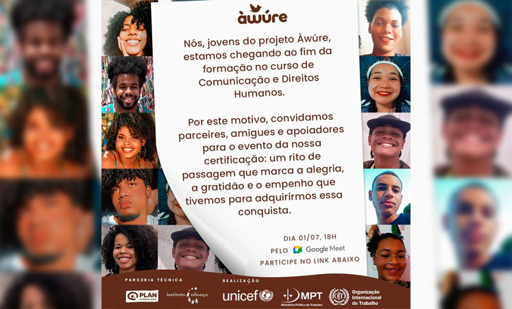 Mais de 100 jovens e adolescentes entre 15 e 20 anos estão se formando no curso “Comunicação e Direitos Humanos”, uma formação de lideranças juvenis do território do Recôncavo e de Salvador, e que faz parte das ações educativas realizadas pelo Projeto Àwúre. Os jovens passaram por três meses de aulas sobre racismo, sexismo, intolerância religiosa e comunicação, e serão certificados em cerimônia virtual pelo Google Meet, no próximo dia 01 de julho, às 18h.