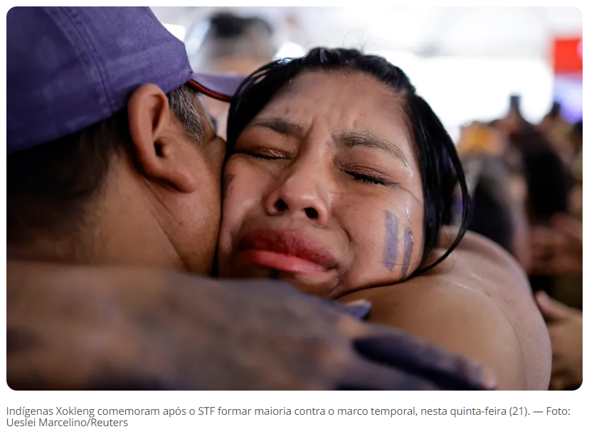 Indígenas Xokleng comemoram após o STF formar maioria contra o marco temporal, nesta quinta-feira (21). — Foto: Ueslei Marcelino/Reuters
