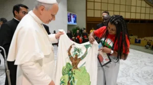 Papa Leão XIV recebe da militante do MST Ayala Ferreira uma imagem de orixá feita com miçangas do candomblé. | Crédito: Vatican Media.